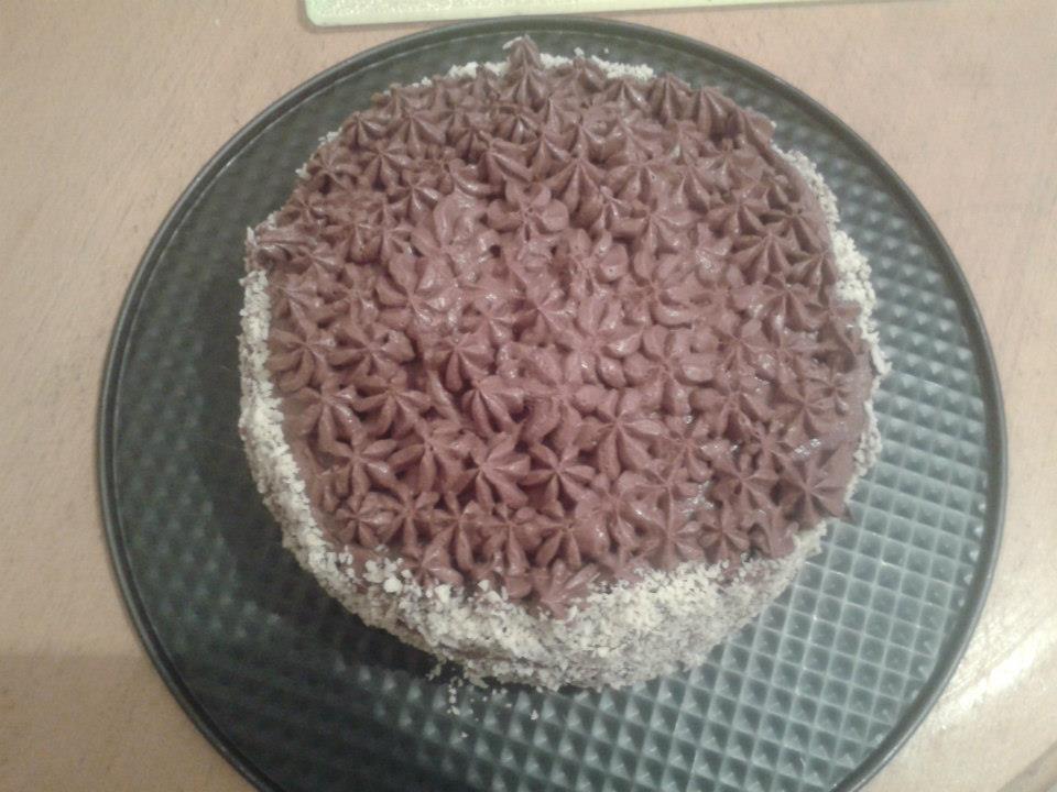 Tort z dodatkiem przepysznego kremu tiramisu z dodatkiem amaretto. Całość obsypana kakao i udekorowana biszkoptami
