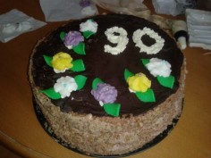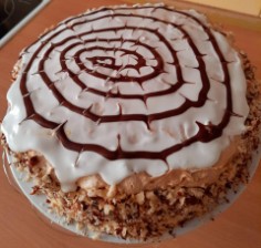 Słynny tort Węgierski z migdałowo - orzechowymi blatami bezowymi. Do tego maślano - budyniowy krem waniliowy. Dekoracyjnie lukier królewski